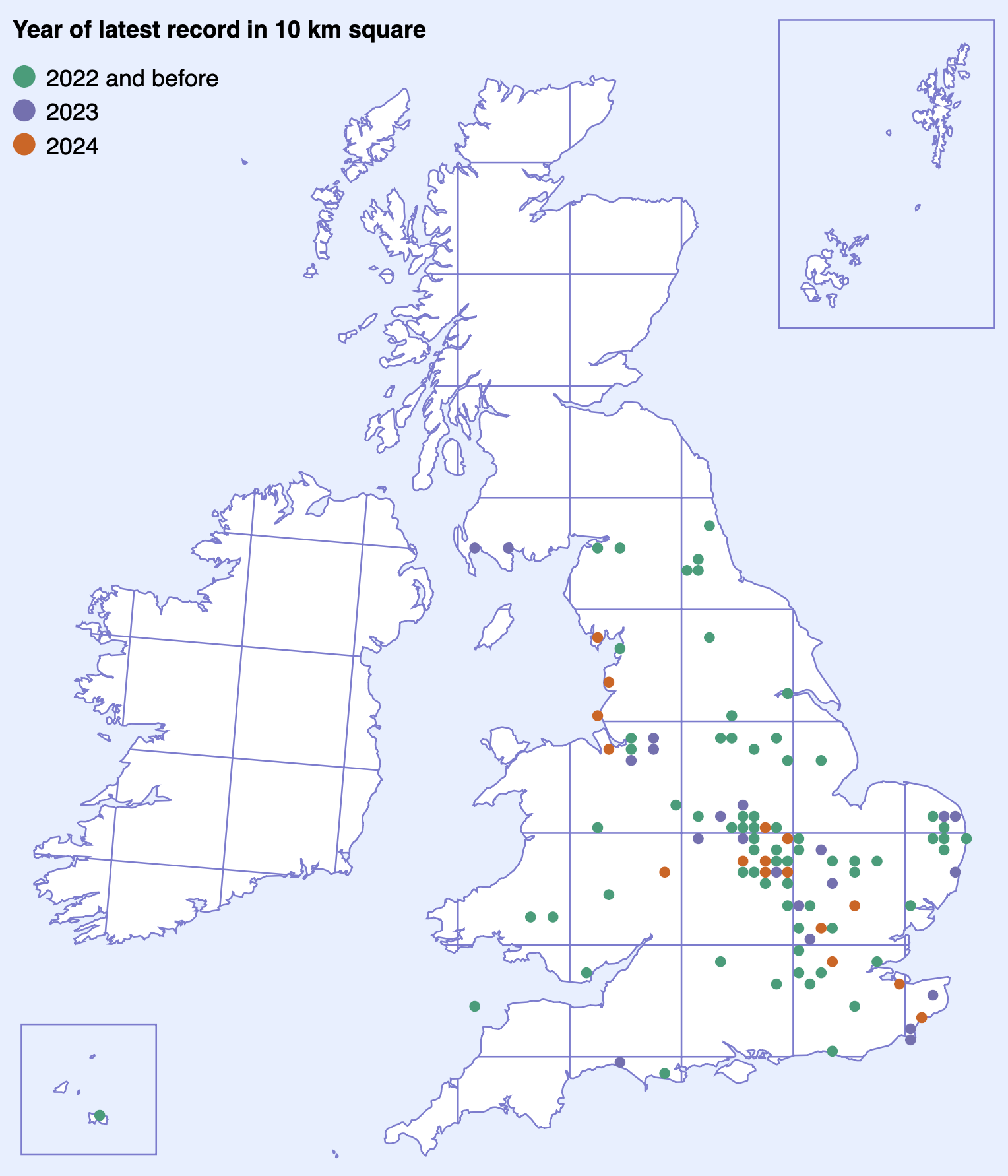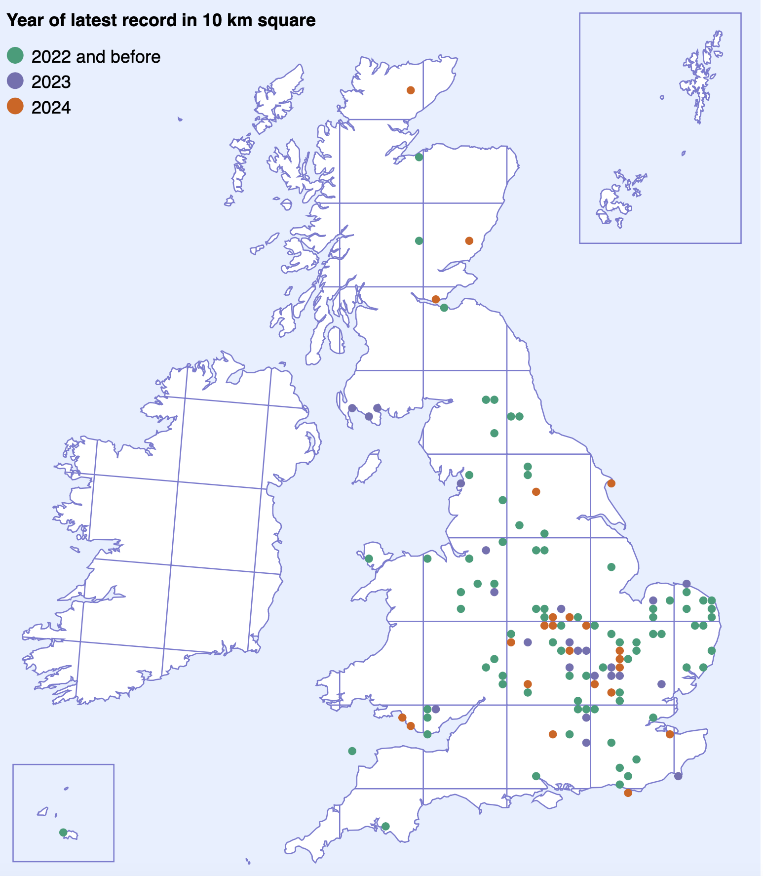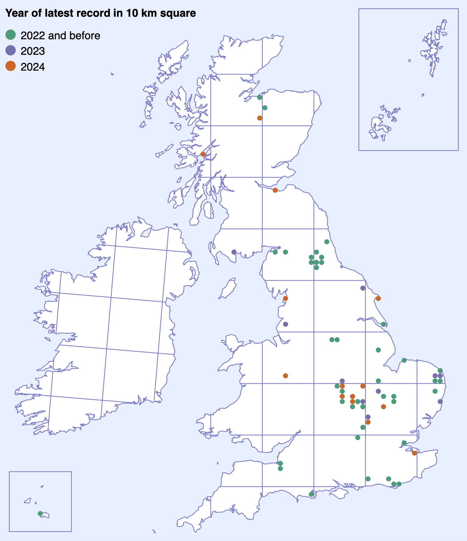 This was the most recorded water bug in 2024 with 165 records. It is ubiquitous across the UK so this map is perhaps showing a view more of recorder effort than it is true distribution. It seems to be increasing too as we convert more family level into species level recording as more people understand that they need to look or take a photo on it’s back to identify rather than the underside.