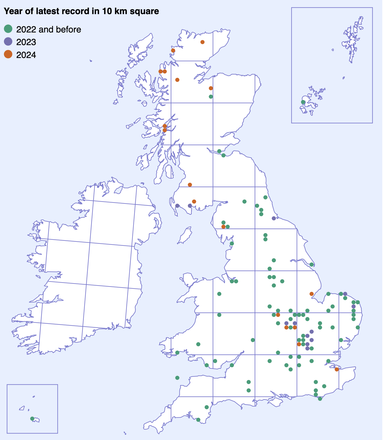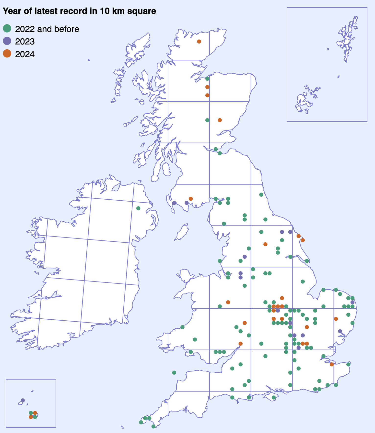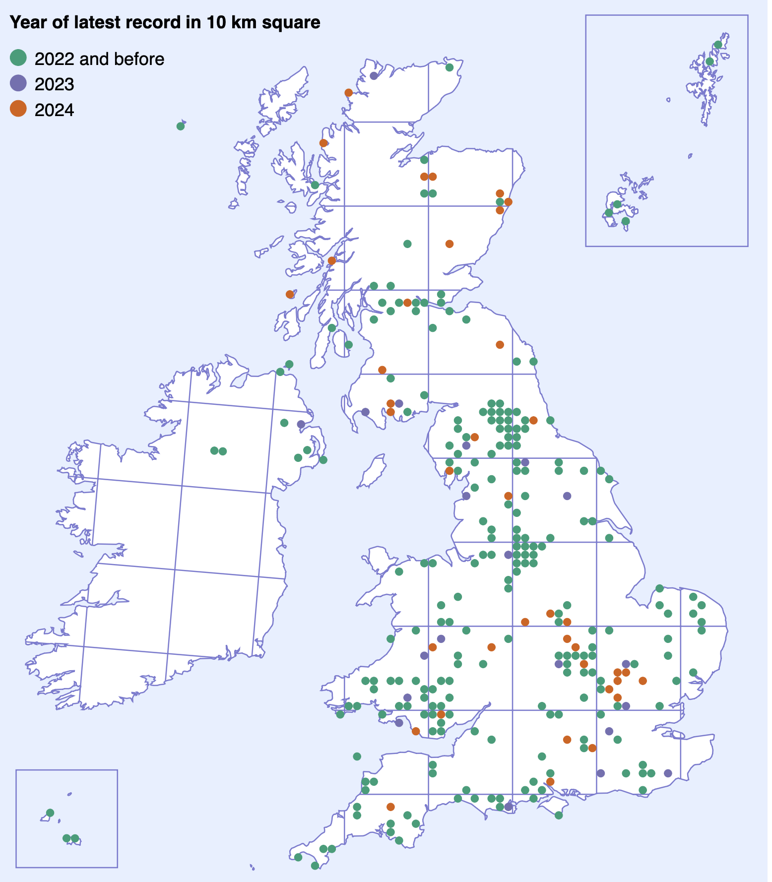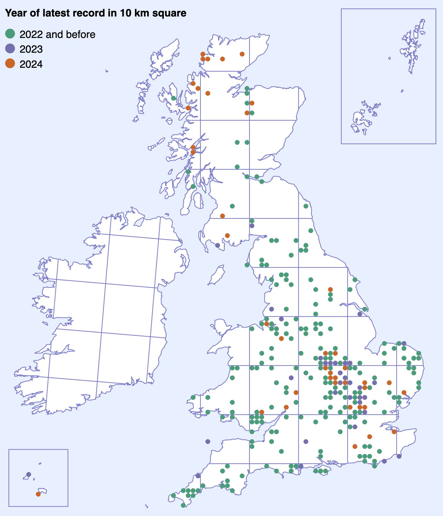 This year there were 14 records. Eight of these were from the Highlands road trip that added extra sites to the map and 3 from Northamptonshire.