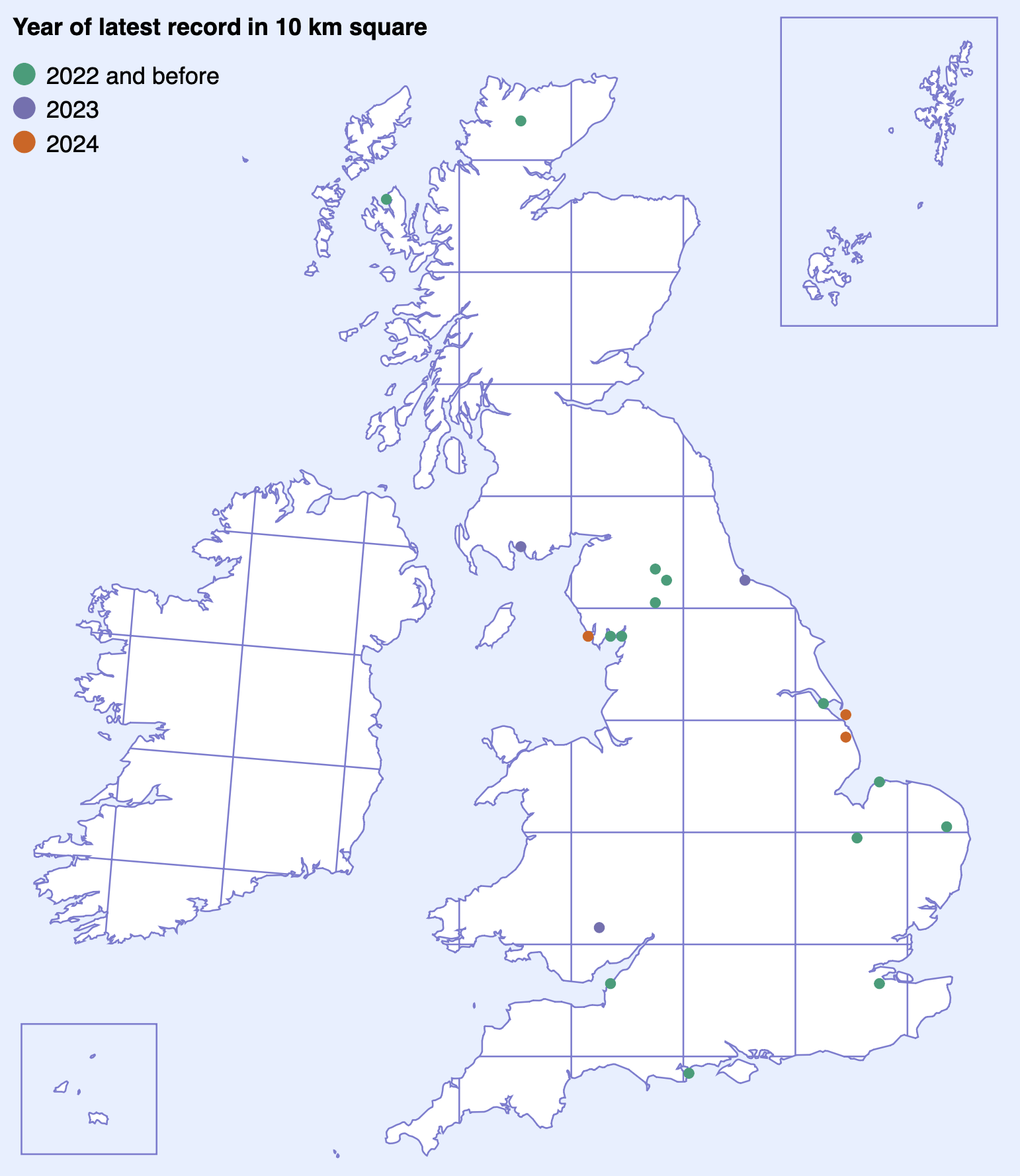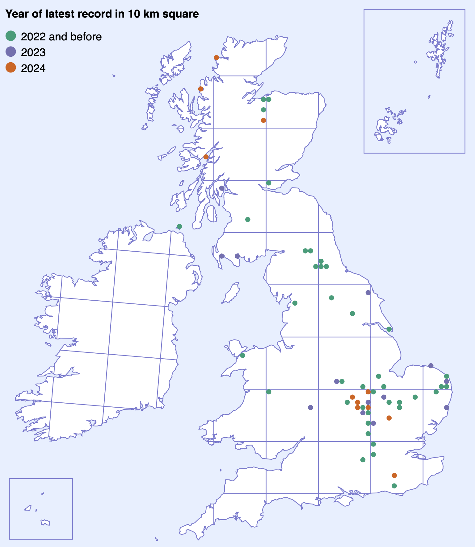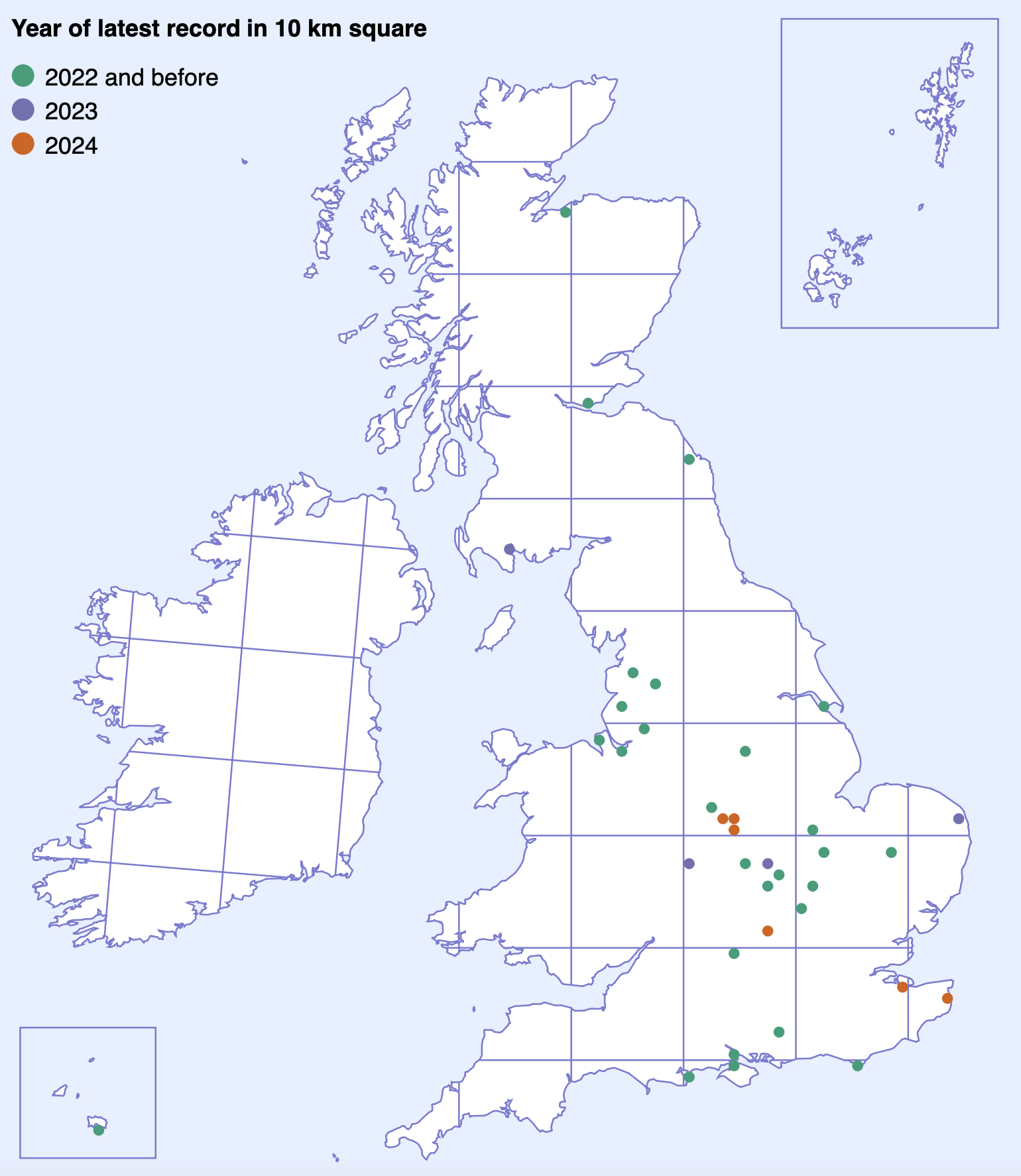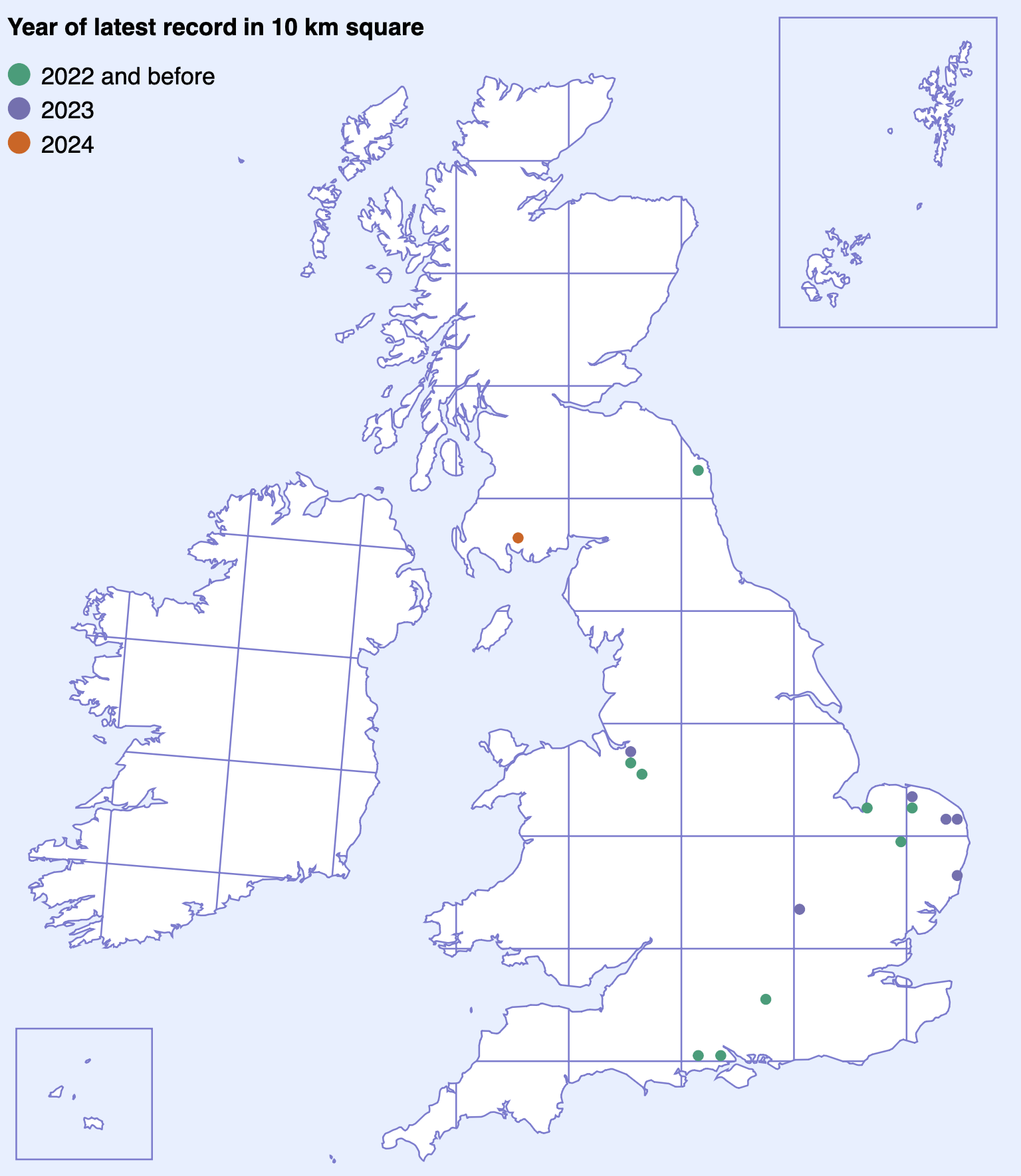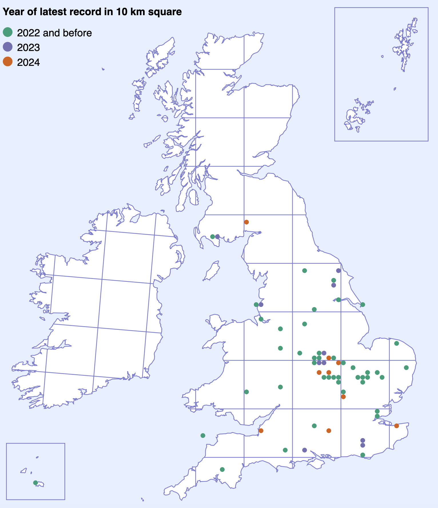 This year there were 14 records. Eight of these were from the Highlands road trip that added extra sites to the map and 3 from Northamptonshire.