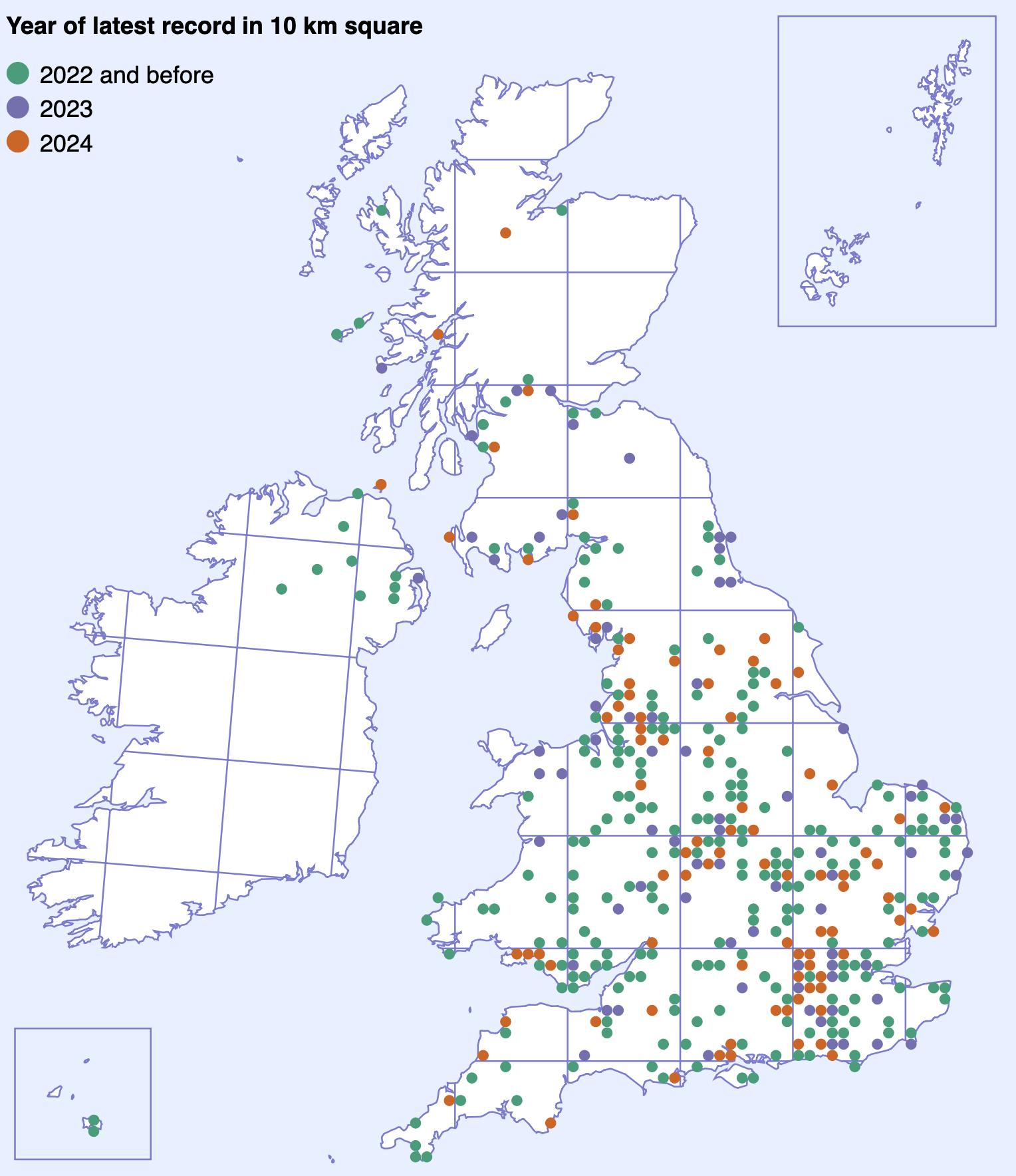 There were 36 records this year of which the majority were within it’s range. Up to 2022 this was spreading North and Westwards but this has not been seen this year.