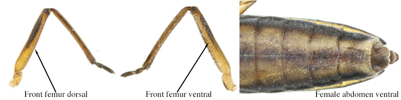 Gerris lacustris is 8.0-10.0mm in length with a black pronotum and antennae. The front femur is pale yellow with black stripes stretching back from the distal end, the dorsal stripe being longer than the ventral (see pictures below). The female has a pale band down the underside of the abdomen, although not always as well marked as in picture below. Somewhat similar looking species are G. gibbifer and G. odontogaster