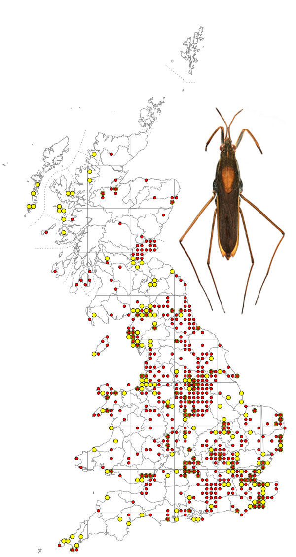 The map is based on records from NBN Gateway, with yellow dots showing pre 1990 records, reds dots 1990 – 2015 records and red on yellow dots overlapping records. A widespread species in the UK, which also occurs throughout Ireland.