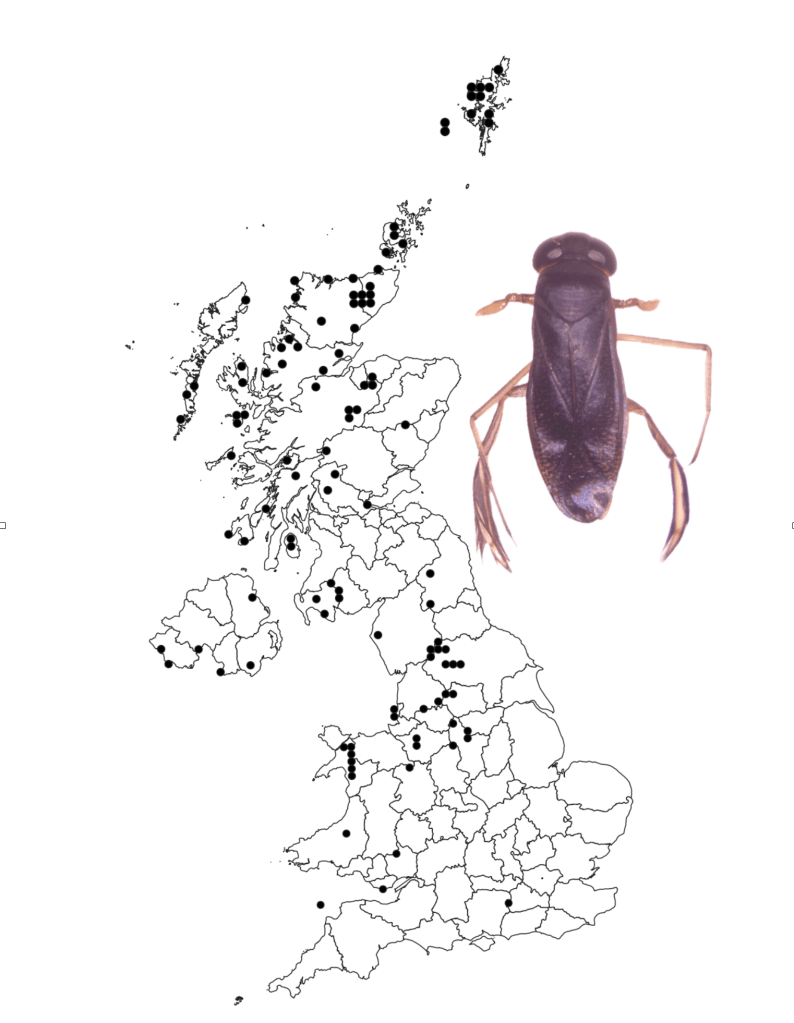Glaenocorisa propinqua cavifrons. This is in upland lakes with a more Northern distribution and identified by the pegs on the male palae have more triangular kink with the point reaching the margin.