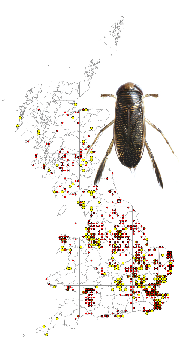 The map is based on records from NBN Gateway, with yellow dots showing pre 1990 records, reds dots 1990 – 2017 records and red on yellow dots overlapping records. Hesperocorixa linnaei has been recorded throughout most of the UK and Ireland.