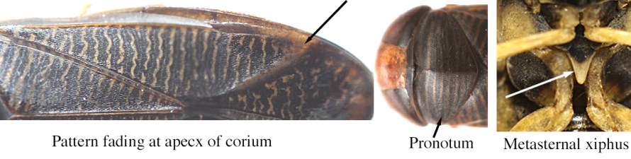 Hesperocorixa spp are distinguished from other groups of lesser water boatmen (Corixidae) by the pale lines on the wingcase which are narrow and extend more or less unbroken across the dark background. In the case of the two larger species, H. sahlbergi (7.0 – 9.0 mm) and H. linnaei (7.0 – 8.0 mm) , there is a distinct contrast between the pale lines and the dark background. In the two smaller species, H. moesta (5.5 – 6.0 mm) and H. castanea, there is little contrast. In all species the metersternal xiphus is much longer than its breadth at the base. H. sahlbergi can be distinguished from H. linnaei by the 7-9 pale lines on the pronotum (H. linnaei has 6) and the pattern of light lines on a dark background fading towards the apex of the corium (in H. linnaei the pattern continues to the apex).