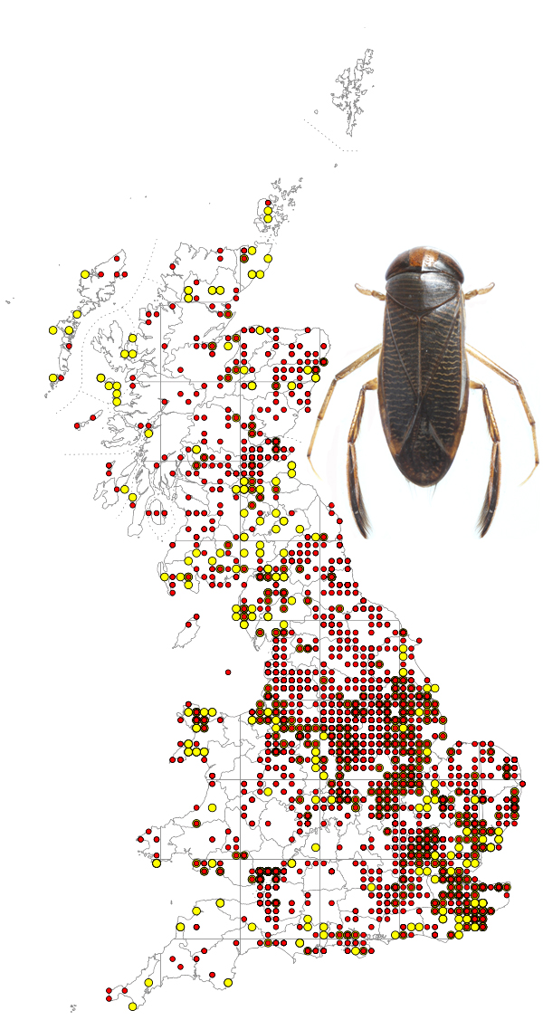 The map is based on records from NBN Gateway, with yellow dots showing pre 1990 records, reds dots 1990 – 2017 records and red on yellow dots overlapping records. Hesperocorixa sahlbergi is widespread in Ireland