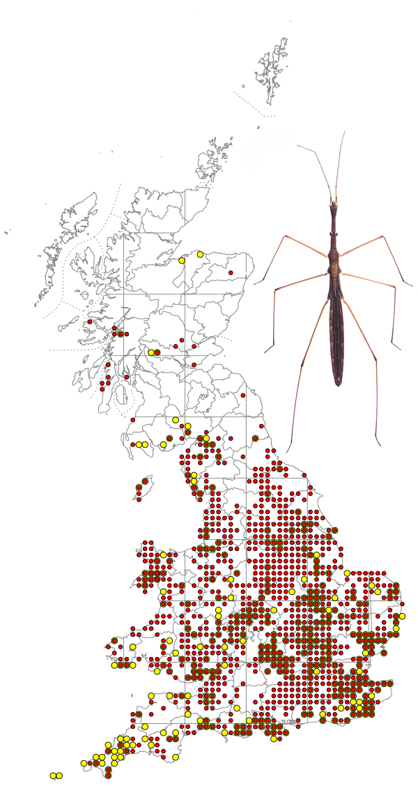 The map is based on records from NBN Gateway, with yellow dots showing pre 1990 records, reds dots 1990 – 2015 records and red on yellow dots overlapping records. A widespread species in the UK, also found throughout Ireland.