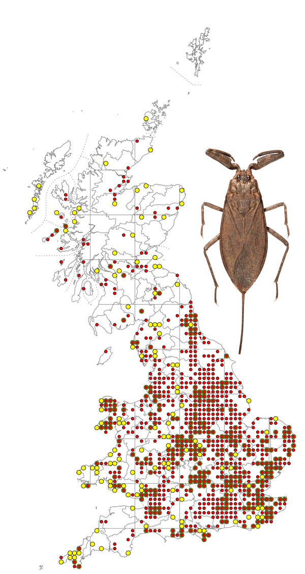 Nepa cinerea, the Water Scorpion, is a widespread species occurring throughout the UK in a variety of aquatic habitats, but usually in shallow water among vegetation. It overwinters as an adult and mating occurs during April and May. Eggs are laid in vegetation just beneath the surface of the water and take 3 to 4 weeks to mature. Nymphs pass through 5 instars (growth stages) and give rise to adults by about mid-August. N. cinerea is a predator and uses its powerful front legs to catch small fish, fly larvae, the larvae of other water bugs and many other aquatic animals. The scorpion-like tail is a harmless breathing tube which acts rather like a snorkel in shallow water habitats, carrying air to the spiracles on the abdomen. Fully developed hind wings are present beneath the wing cases and N. cinerea is able to fly to new habitats, but most individuals are incapable of flight because of under-developed flight muscles. Variation in wing muscle development is fairly common in bugs and other insects and depends on the benefits of migration versus the benefits of using the energy that would have been used on flight muscle for other purposes, such as reproduction.