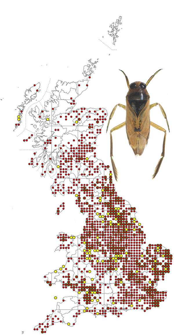The map is based on records from NBN Gateway, with yellow dots showing pre 1990 records, reds dots 1990 – 2015 records and red on yellow dots overlapping records. Notonecta glauca is a widespread species both in the UK and Ireland.