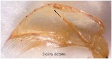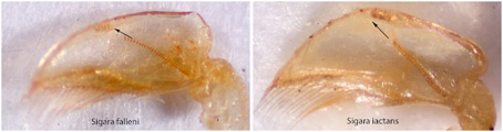 Sigara iactans and S. falleni are reliably distinguished by the difference in the shape of the male palae, the enlarged and flattened front tarsi characteristic of corixids, and in the alignment of pegs on their ventral surface. S. falleni has a pala with a more pronounced, deeper basal lobe (the rounded ‘shoulder’) and a diagonal line of pegs which, if continued, would meet the inner (proximal) end of the short row of pegs situated in the middle of the upper border. In the case of S. iactans the basal lobe is smaller and the diagonal row of pegs line up with the outer (distal) end of the top row of pegs (see below). Females of the two species are hard to separate.