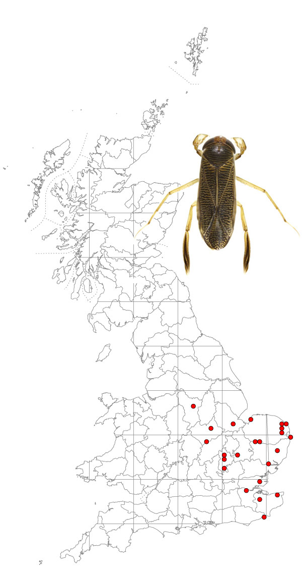 The corixid, or lesser water boatman, Sigara iactans is a species new to Britain, first recorded on the North Norfolk coast at Snettisham in 2005 (Brooke 2005) and since then at other sites in various midland and south-eastern counties (see map) . Sigara iactans is closely related to the common native species S. falleni and may well have been overlooked for some time before 2005 – in fact is was found in a sample from the Norfolk broads collected in 2004 that was re-examined in the light of recent discoveries (Sheila Brooke, pers. comm.). The two species look very similar and often occur together in a range of habitats with a preference for sparsely vegetated sites with little organic matter.