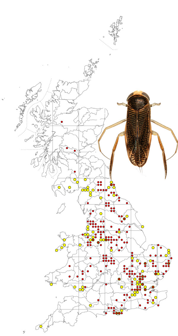 The map is based on records from NBN Gateway, with yellow dots showing pre 1990 records, reds dots 1990 – 2015 records and red on yellow dots overlapping records. The recent Scottish records should be treated with caution as there is some doubt about their validity. There is a single recent record for Ireland (County Mayo).